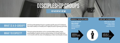 A D-Group (Discipleship Group) is a gender-specific group of 3-5 believers that meets weekly or bi-weekly and is highly focused on growing spiritually through spiritual disciplines such as consistent Bible reading, prayer, accountability, Scripture memory, and journaling. A D-Group meets from 12-18 months with the vision of multiplying to make more disciples of Jesus.