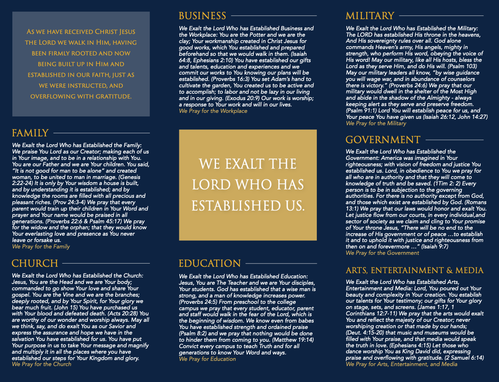 Let our reputation be of our faith in Christ alone, our love for all people, and fruitful lives bearing the attitude, affections, and actions of Your Spirit, Who dwells and works within us and through us. We pray for America: the Church, Family, Education, Military, Workplace, Government, Arts, Entertainment and Media. United in Your love, we exalt the Lord who has established us.